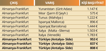 Bu tabloya göre, Türkiye fiyatları Mısır hariç incelediğim örnekteki her ülkenin gerisinde görünüyor. Özellikle İtalya, İspanya, Tunus ve Yunanistan fiyatları bizden oldukça yüksek düzeylerde. Aslında bu veriler istatistiksel olarak tam manasıyla toplamı ve ortalamayı göstermez ama fikir vermesi açısından kanımca önemli. İncelediğim diğer farklı çıkış noktalarında da fiyat düzeyleri benzerlik gösteriyor.