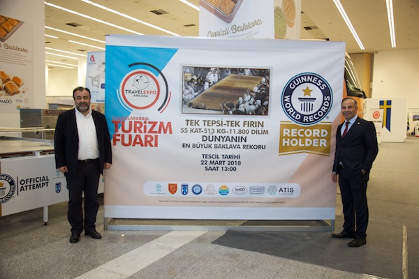 Burada en büyük avantajımız sizin de bahsettiğiniz gibi hep en iyilerle çalışmamız oldu. Öncelikle Ankara Valimizin etkinliğe katkısı ve desteği oldukça önemliydi. Makine ve teçhizatın üretilmesinde Kristal Endüstriyel ile hatasız bir üretim gerçekleştirdik. Baklavanın pişirilmesinde TAŞPAKON VE MADO Dondurma’nın ustaları ile birlikte çalıştık. İşin doğrusu genel kanı odur ki ustalar zor insanlardır. Ancak bizler orada öyle bir takım ruhu oluşturduk ve herkesin ortak amacımız olan dünya rekoruna odaklanmasını sağladık ki baklava üretim sürecinde birbirini tanımayan çok sayıda usta sorunsuz bir biçimde üretim sürecini tamamladı. Baklava piştikten sonra havaya kaldırma ve tartım işlemlerini ise Bilim Sanayi ve Teknoloji İl Müdürlüğü, Atalay Elektronik ve Tümpet işbirliği ile gerçekleştirdik. Bu kadar büyük bir tepsiyi havaya kaldırarak tartmak gerçekten zor bir işti ancak sizin de bahsettiğiniz gibi bir hep en iyilerle çalıştık. Anadolu Turizm İşletmecileri Derneği ve TÜRSAB’da organizasyonumuza destek vererek başarı sağlamamıza katkı sağladılar. Bana birçok kişi baklavanın lezzetli olup olmadığını sordu. İşin doğrusu ben yoğunluktan ve misafirleri ağırlamaktan tadına dahi bakamadım. Ancak yaklaşık 12 bin civarında baklava diliminin Travel Expo Fuarı katılımcısı tarafından bir buçuk saat içerisinde tüketilmesi sanırım baklavanın lezzeti hakkında da bir fikir veriyordur. Tadına bakma fırsatı bulanlar da tadına doyamadıklarını bana bildirdiler. Bu da beni ve ekibimizi ziyadesiyle mutlu etti.