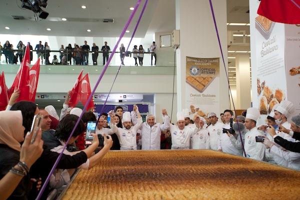 Öncelikle neden baklava seçtiğimize değinmek istiyorum. Dünya genelinde Türkiye’yi tanıyan yabancılar arasında Türk’ün yemeği kebap, tatlısı da baklava olarak bilinir. Baklava dünya çapında da bilinen ve sevilen bir tatlıdır. Türklerin dışında en çok Ortadoğulular, Yunanlılar ile diğer Balkan ülkeleri, Çekler ve hatta ABD’liler baklavayı en çok tüketen ve bu tatlılının kendilerine ait olduğunu iddia eden ülkelerdir. Bu kadar popüler olan bir tatlının en büyüğünü yaparak bir anlamda bunu Türk tatlısı olarak tescil etmek dünya genelinde ses getirdi ve çeşitli polemiklere yol açtı. Özellikle dünya genelinde sosyal medyada bu konuda tartışmalar başladı ancak rekoru kıran biz olduk. Zaten bu işe başlarken medyada da kullandığımız sloganımız “Baklava Türk’tür Türk kalacak” idi ve sanırım işe de yaradı.
