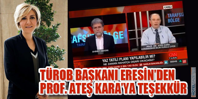 Türkiye Otelciler Birliği TÜROB, Bilim Kurulu Üyesi Prof. Dr. Ateş Kara’ya teşekkür etti. TÜROB Başkanı Müberra Eresin, sosyal medya hesabı Facebook’tan yaptığı açıklamada CNN Türk’te yayınlanan Ahmet Hakan’ın sunduğu Tarafsız Bölge programında yaptığı açıklamalarla turizm sektörü çalışanlarına ümit verdiğini belirtti. TÜROB Başkanı Eresin’in Prof. Dr. Ateş Kara için yayınladığı teşekkür mesajı şöyle:
