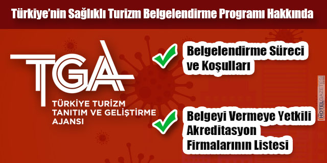 Türkiye’nin Sağlıklı Turizm Belgelendirme programı, tatilini Türkiye’de geçirecek tüm Türk vatandaşları ve yabancı ziyaretçilere, ulaşımdan konaklamaya, tesis çalışanlarından yolcuların kendi sağlık durumuna uzanan geniş bir yelpazede bir dizi alınması önerilen tedbirleri tanımlıyor. Zorunlu olmayan, isteğe bağlı bu belgelendirmeyi başvurmak isteyen tesis işletmeleri; yetkili uluslararası akreditasyon kuruluşlarına başvuruda bulunabilecektir.