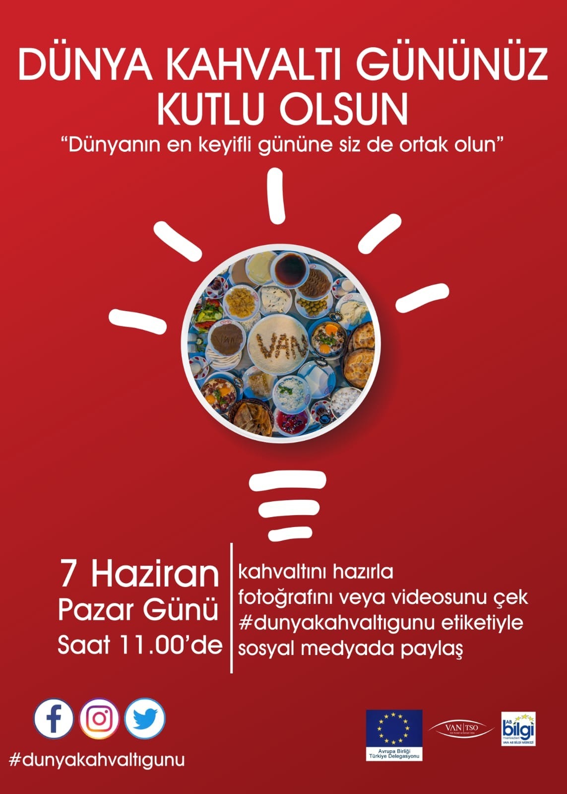 İlki bu yıl Türkiye’nin en uzun caddesi olan İskele Caddesi üzerinde kutlanması planlanan Dünya Kahvaltı Günü, yaşanan Koronavirüs (Kovid-19) nedeniyle sosyal medya üzerinden yapılacak olan fotoğraf ve video paylaşımları ile kutlanacak. 7 Haziran Pazar günü yapılacak olan etkinlik saat:11.00’de başlayacak. Van Ticaret ve Sanayi Odası’ndan yapılan açıklamada, bu yılki etkinliğin korona virüs ile mücadele eden sağlık çalışanlarımıza ve salgına yakalanıp hayatını kaybeden tüm insanlara atfedildiği bildirildi.