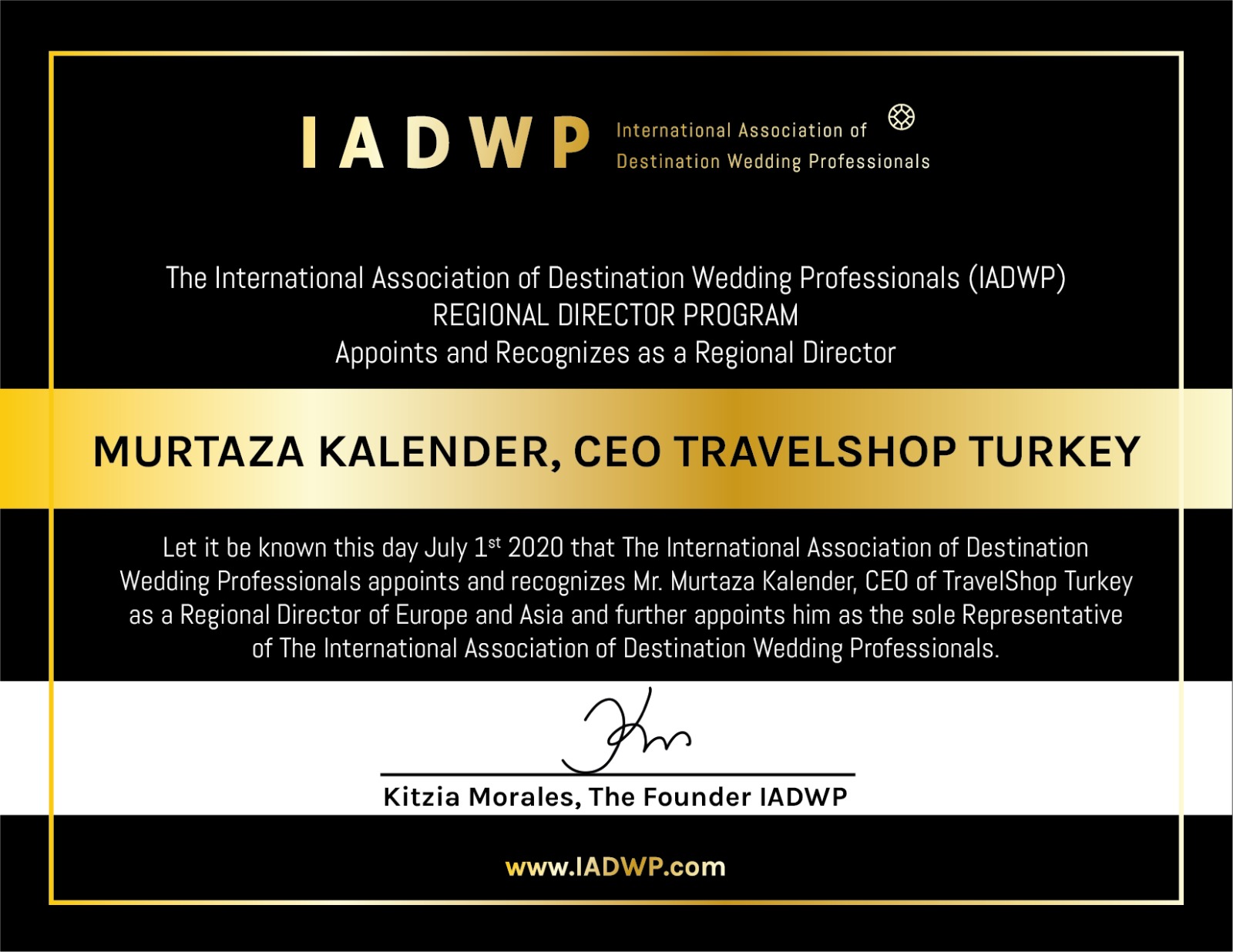 Murtaza Kalender, bu kez de Uluslararası Düğün Organizatörleri Birliği’nin Avrupa ve Asya Bölgesel Direktörlüğüne seçildi. Kalender, haberi turizm dünyasıyla paylaşırken, düşüncelerini şu sözlerle dile getirdi: “Bugün 2. kez almış olduğum güzel ve hayırlı bir haberi sizlerle paylaşmak istiyorum. Uluslararası Düğün Organizatörleri Birliği’nin Avrupa ve Asya Bölgesel Direktörü olarak seçilmiş bulunmaktayım.
