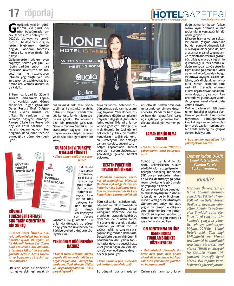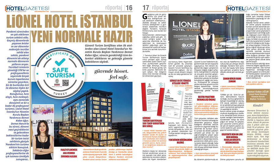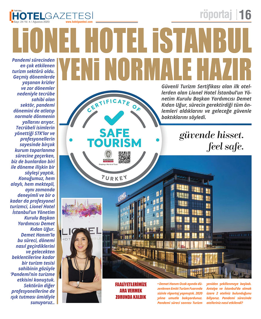 Güvenli Turizm Sertifikası alan ilk otellerden olan Lionel Hotel İstanbul’un Yönetim Kurulu Başkan Yardımcısı Demet Kıdan Uğur, sürecin gerektirdiği tüm önlemleri aldıklarını ve geleceğe güvenle baktıklarını söyledi.