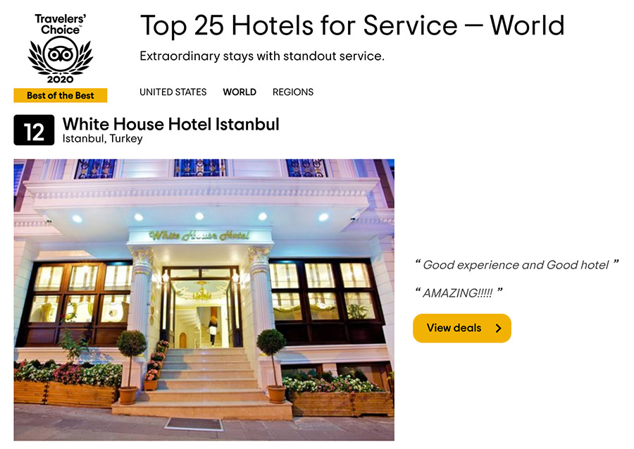 TripAdvisor sayfasında, Konum, Temizlik, Servis ve Değer kategorilerinde yapılan değerlendirmelerden aldığı tam puanlarla Best of Best (En iyisi) olarak sonuç alan White House Hotel İstanbul için yapılan değerlendirme şöyle: “Tarihi yarımadanın kalbinde yer alan White House Hotel İstanbul, Ayasofya, Sultanahmet Camii, Topkapı Sarayı, Arkeoloji Müzesi, Yerebatan Sarnıcı, Kapalı Çarşı, Mısır Çarşısı, Milenyum Taşı ve Bizans Hipodromu’na gibi şehrin en önemli simgelerine yürüme mesafesindedir. White House Hotel İstanbul, bu Osmanlı başkentinin sonsuz tarihi mekanlarını, müzelerini, restoranlarını, kulüplerini ve alışveriş mekanlarını keşfetmek için ideal bir başlangıç noktasıdır.”