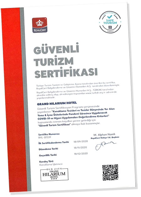 Güvenli Turizm Sertifikası, yeni tip koronavirüs ile mücadele (Kovid-19) kapsamında, olağanüstü salgın koşullarında sağlıklı ve güvenli bir turizmi mümkün kılmak ve alınan tedbirlerin üst seviyede güvenirliliğini sağlayabilmek için Türkiye Turizm Tanıtım ve Geliştirme Ajansı koordinasyonunda ve “www.tga.gov.tr” adresine müracaat edilerek alınıyor. Konaklama tesisinde üst düzey sağlık ve hijyen koşullarının yerine getirildiğini belgeleyen bu sertifikanın, uluslararası kuruluşlar tarafından aylık denetimlerle devamlılığı sağlanıyor. “Güvenli Turizm Sertifikası”nın, Bakanlık belgeli olan veya olmayan 30 oda ve üzeri kapasitedeki tüm konaklama tesislerince de alınması zorunlu.