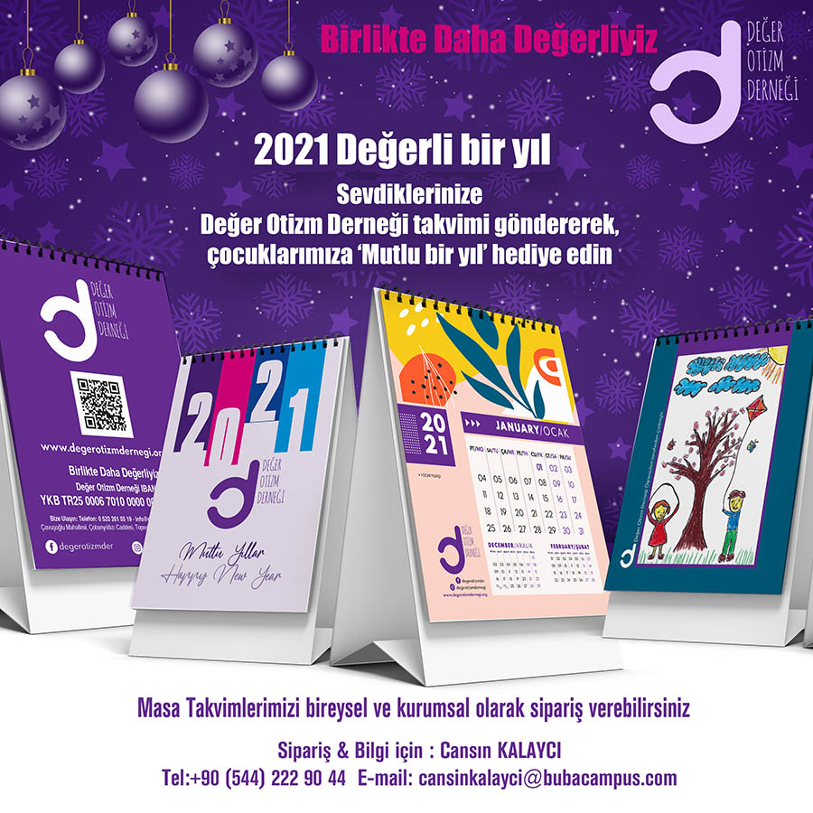 Bu yıl göndereceğiniz yeni yıl hediyesi paketine, Değer Otizm Derneği’nin şık takvimlerinden ilave ederek, hem sevdiklerinizde otizme karşı duyarlılık oluşturabilir, aynı zamanda otizmli bireylerin rehabilitasyon merkezine katkıda bulunabilirsiniz.