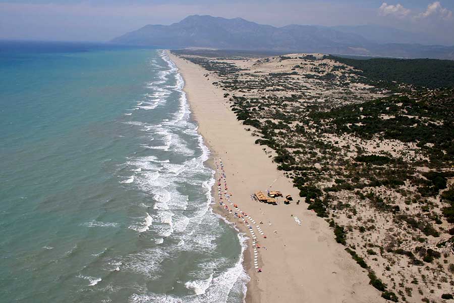 Patara’nın Plajı ise Patara antik kentinden geçilerek ulaşılan bölgedeki en büyük ve güzel plajlardan biridir. Patara plajı bakirliği ile en görkemlisidir. 12 km uzunluğundaki plajın kum derinliği yer yer 200-300 metreye ulaşır. Kumu incedir ve parlar. Deniz ise sığdır. Plajın büyük bir kısmı Carettalar için ayrılmış olup turistlerin kullanacağı alan ile ayrılmış, koruma altındadırlar.
