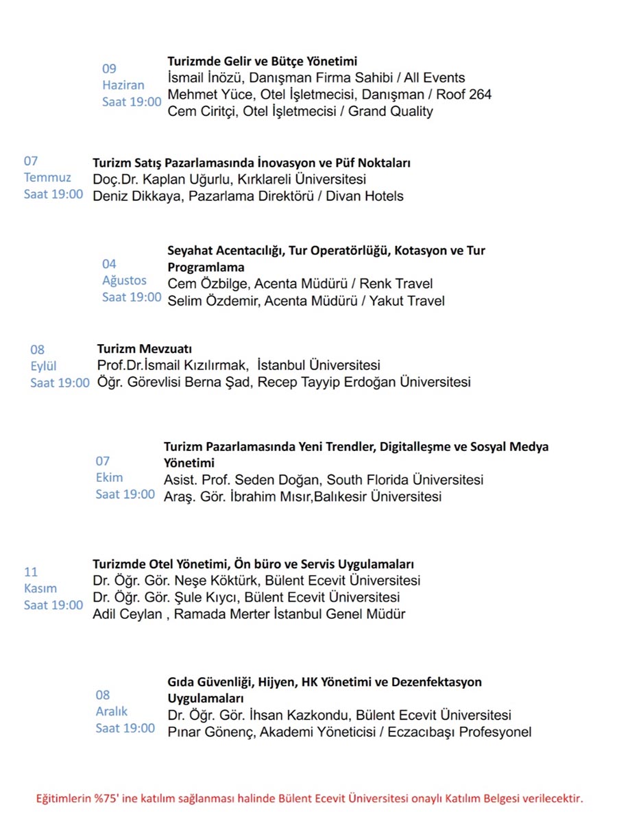 Karaelmas Turizm Eğitim Projesi genel programı: