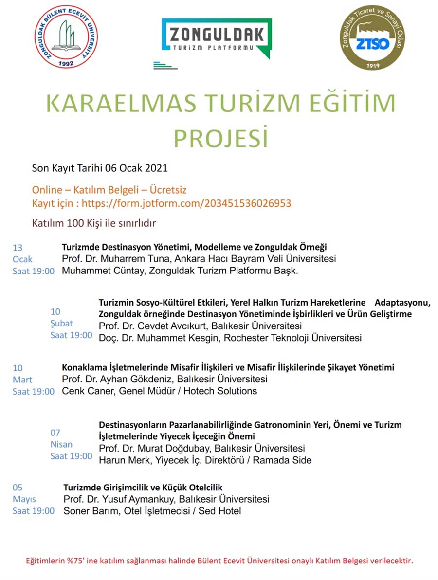 ‘Karaelmas Turizm Eğitim Programı’nın ilk dersi Turizmde Destinasyon Yönetimi Modelleme ve Zonguldak Örneği başlığı altında organize edildi. Ankara Hacı Bayram Veli Üniversitesi öğretim üyesi Prof. Dr. Muharrem Tuna ve Zonguldak Turizm Platformu Başkanı Muhammet Cüntay’ın katıldığı online eğitime ilk dersin beklenenin üzerinde ilgi görmesi organizasyon yetkililerini mutlu etti.