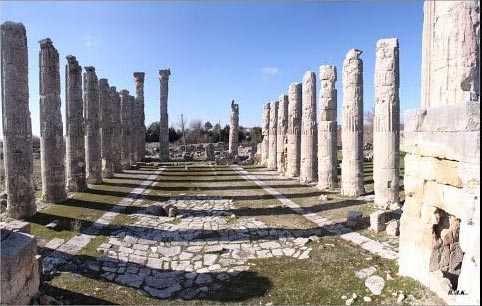 Kapının ardından tarihi çeşmesi görülen antik kentte, geniş bir avluda yer alan ve 36 büyük sütunla çevrili olan Zeus Tapınağı’na ulaşılıyor.