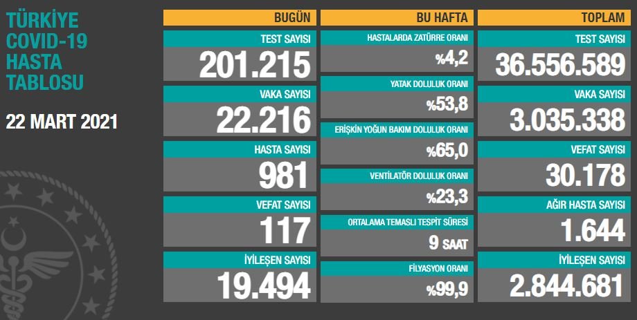 Sağlık Bakanlığı’nın 22 Mart verilerine göre semptom gösteren 981 hastayla birlikte 22 bin 216 yeni vaka tespit edilmişti. 117 kişi hayatını kaybederken 19 bin 494 kişi de sağlığına kavuşmuştu.