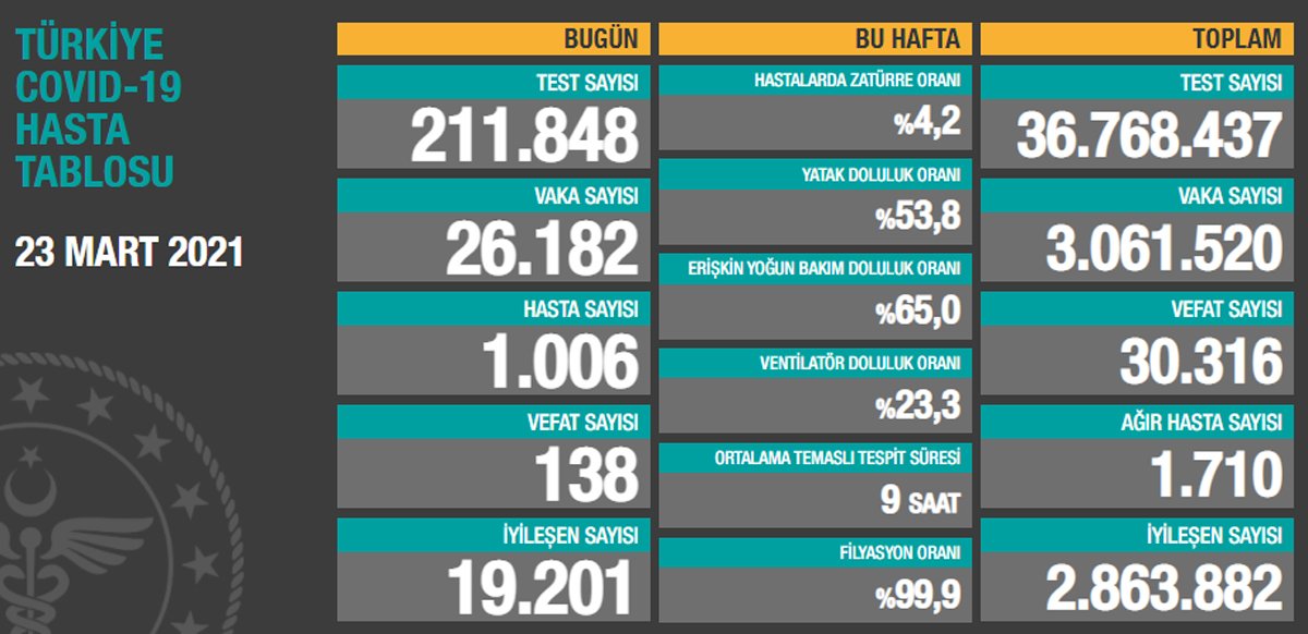 Sağlık Bakanlığı, Türkiye’nin COVID-19 hasta tablosunu açıkladı. 23 Mart Salı gününün verilerine göre 211 bin 848 testin daha yapılmasıyla toplam test sayısı 36 milyon 768 bin 437’ye ulaştı.