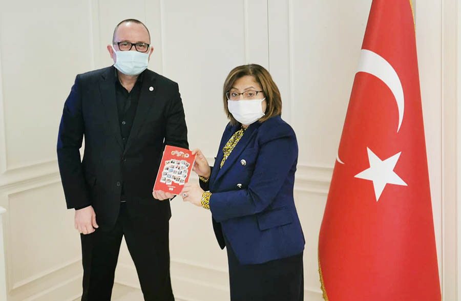 Gastronomi Turizmi Derneği Başkanı Gürkan Boztepe ve TMG Başkanı Volkan Ataman; Gaziantep Büyükşehir Belediye Başkanı Fatma Şahin’i makamında ziyaret etti. Yapılan görüşmede; Turizm Medya Grubu ve Gastronomi Turizmi Derneği (GTD) ortaklığıyla 2-4 Haziran 2021 tarihleri arasında İstanbul Kongre Merkezi açık alan-ICC’ de düzenlenecek olan Gastro Show etkinliği ve etkinlikle ilgili yapılan çalışmalar konuşuldu.