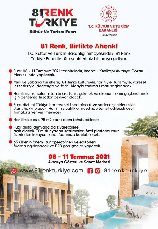 Turizm sektörü, pandemiden en çok etkilenen sektör olmasına rağmen, düzenlenen etkinliklerle, mücadelesini sürdürüyor. Bu etkinliklerden biri de 08-11 Temmuz 2021 tarihlerinde Yenikapı Avrasya Gösteri Merkezi’nde açılacak 81 RENK TÜRKİYE FUARI.