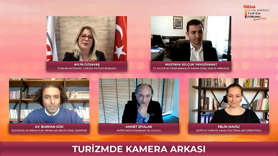 TÜRSAB Incoming Turizmi İhtisas Başkanı Aylin Özsavaş’ın moderatörlüğünde düzenlenen ‘Turizmde Kamera Arkası’ paneli, T.C. Kültür ve Turizm Bakanlığı Sinema Genel Müdür Yardımcısı Mustafa Selçuk Yavuzkanat, Televizyon ve Sinema Filmi Yapımcıları Birliği Genel Sekreteri Av. Burhan Gün, Inter Medya Başkanı ve COO’su Ahmet Ziyalar ve Netflix Türkiye Kamu Politikaları Direktörü Pelin Mavili’nin katılımlarıyla gerçekleşti.
