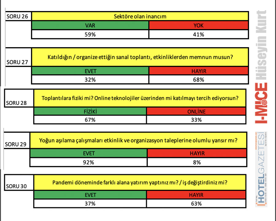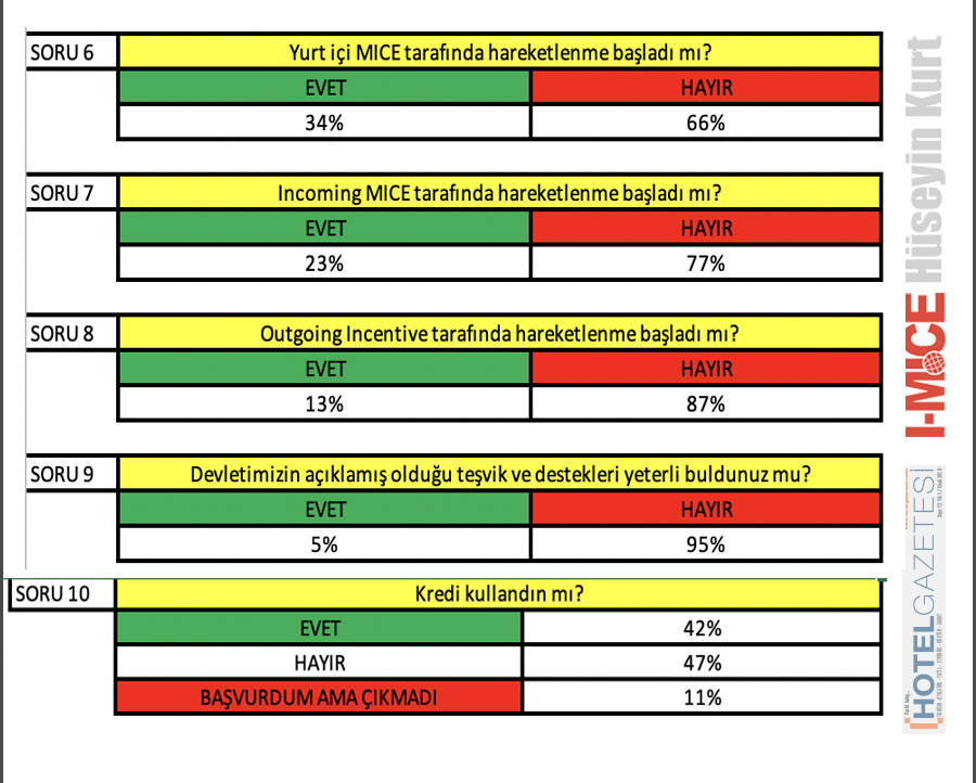 *Devletimizin açıklamış olduğu teşvik ve desteklerin oldukça yetersiz kaldığı anketlere yansımakla birlikte, Kültür ve Turizm Bakanlığı’nın da süreci doğru yönetemediğini yansımalarda görüyoruz. Ayrıca muhalefet partilerinin de süreç içerisinde sektörün sesi olamadıkları ankete yansımış durumda.