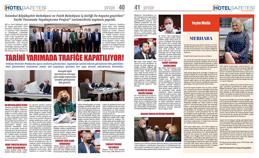 İstanbul Büyükşehir Belediyesi ve Fatih Belediyesi iş birliği ile hayata geçirilen“ Tarihi Yarımada Yayalaştırma Projesi” turizmcilerle toplantı yapıldı. BU BİR BAŞLANGIÇ OLSUNHEDEF TURİSTİN BÖLGEYE RAHAT ULAŞABİLMESİTAKSİLER YEŞİL ALANA GİREBİLMELİYENİKAPI PROJEDE YER ALMALI!AKSARAY’DA KARGO TRAFİĞİ SORUNUTARİHİ YARIMADA SAKİNLEŞMELİ