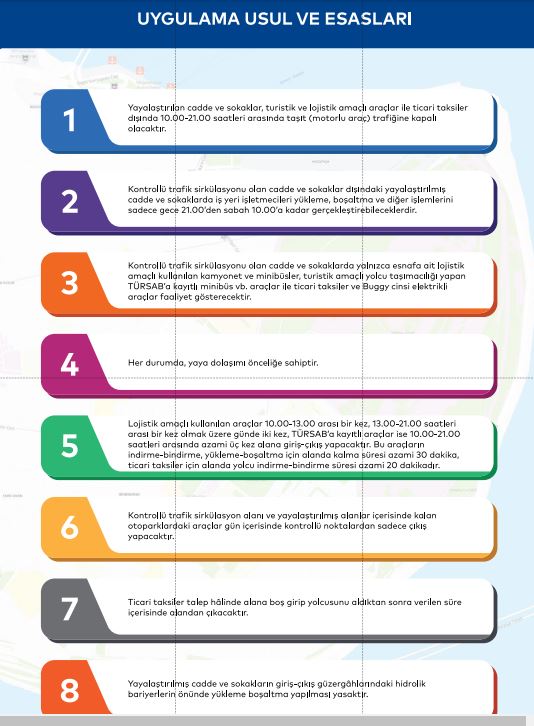 Kontrollü trafik sirkülasyonunun sağlanacağı cadde ve sokaklar; resmi, turistik ve lojistik amaçlı araçlar ile ticari taksiler dışında 10.00-21.00 saatleri arasında taşıt (motorlu araç) trafiğine kapalı olacak. Kontrollü trafik sirkülasyonu olan cadde ve sokaklar dışındaki yayalaştırılmış cadde ve sokaklarda; iş yeri işletmecileri yükleme, boşaltma ve diğer işlemlerini sadece gece 21.00’den sabah 10.00’a kadar gerçekleştirebilecek.