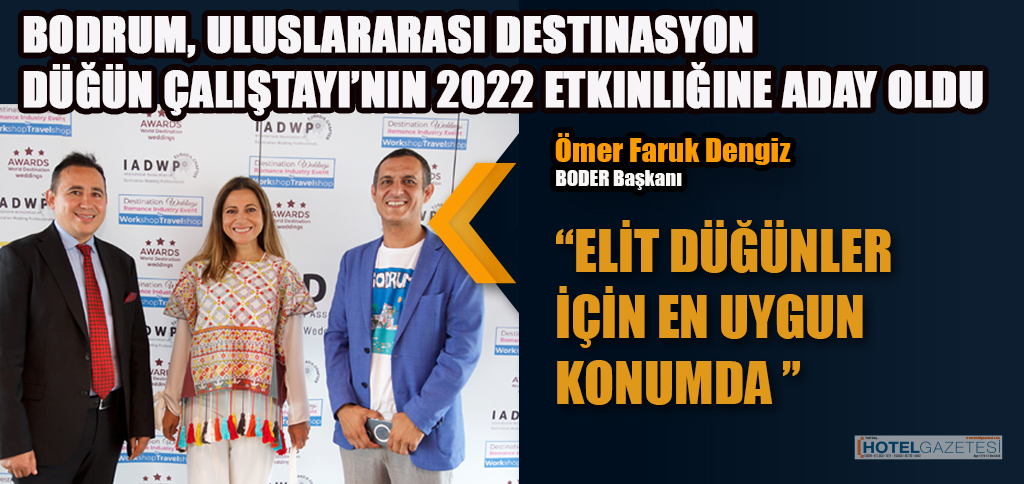 Türkiye’nin deniz, güneş, kum ve aşk denince ilk akla gelen turizm merkezlerinden olan Bodrum, 300 milyar dolar bütçeli Destinasyon Düğünleri turizminden de pay almak istiyor. Bodrum Otelciler Derneği (BODER) Başkanı Ömer Faruk Dengiz, İstanbul’a gelerek Uluslararası Düğün Profesyonelleri Derneği (IADWP) Başkanı Kitzia Morales ile IADWP Avrasya Başkanı Murtaza Kalender ile görüştü ve Uluslararası Destinasyon Düğün Çalıştayı’nın 2022 yılında Bodrum’da yapılmasını arzuladıklarını belirterek, Bodrum’un 2022 adaylığı için başvuruda bulundu.