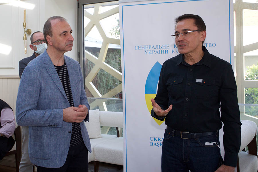 Ukrayna İstanbul büyükelçisi Vasil Bodnar konukları ile tek tek ilgilenirken, etkinliği organize eden Gürkan Boztepe’ye Ukrayna’ya özgü el yapımı plaket takdim etti.