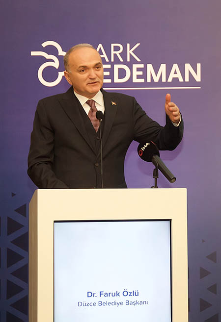 İmza töreni Düzce Belediye Başkanı Dr. Faruk Özlü’nün konuşmasıyla devam etti. Özlü bu proje ile Düzce için bir hayalin gerçekleştiğini belirterek, “Ankara-İstanbul hattında otel ve dinlenme tesisleri bir tarafta Sapanca’da, diğer tarafta ise Bolu’da sona eriyordu. Bu iki bölge arası bugüne kadar çok bakirdi. Bu eksikliği giderecek olan Park Dedeman Düzce’nin, şehrimizin kalkınmasında önemli bir sıçrama yaratacağını düşünüyorum. Cihat Algün ve Banu Dedeman’a bu hayalimizi gerçekleştirdikleri için yürekten teşekkür ediyorum. Düzce’yi iki bölümde düşünürsek, güneyinde yayla ve şelaleler, kuzeyinde ise tarih ve deniz var. Türkiye’nin kuzeyindeki tek antik tiyatronun kazıları bizim imkânlarımızla gerçekleşiyor. Şu anda yüzde 70’i tamamlanmış durumda. Kazı çalışmasının bitirilmesinin ardından antik tiyatroyu restore ederek, turizme kazandırmayı hedefliyoruz. Hem yeni yapılacak ilk 5 yıldızlı marka otelimiz hem antik tiyatromuz hem de doğal güzelliklerimizin Düzce’yi daha ileriye taşıyacağına inanıyorum” dedi.