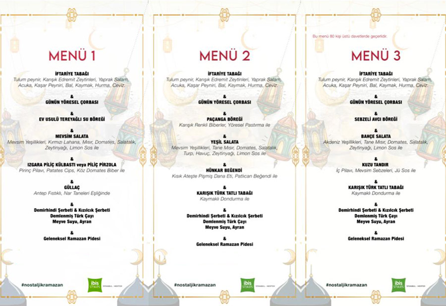 İbis Style Merter’in Ramazan ayına özel üç farklı menüsü ve ayrıntıları şöyle: