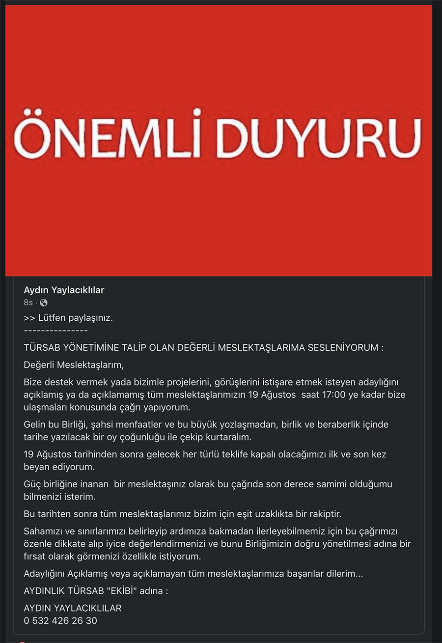 TÜRSAB Başkanlığına adaylığını açıklayan Aydın Yaylacıklılar, bu açıklamanın akşamında ikinci bir duyuru ile aday olduğunu resmen açıklayan ve açıklamayan diğer adaylara görüşme çağrısında bulundu. Yaylacıklılar’ın çağrısı şöyle: