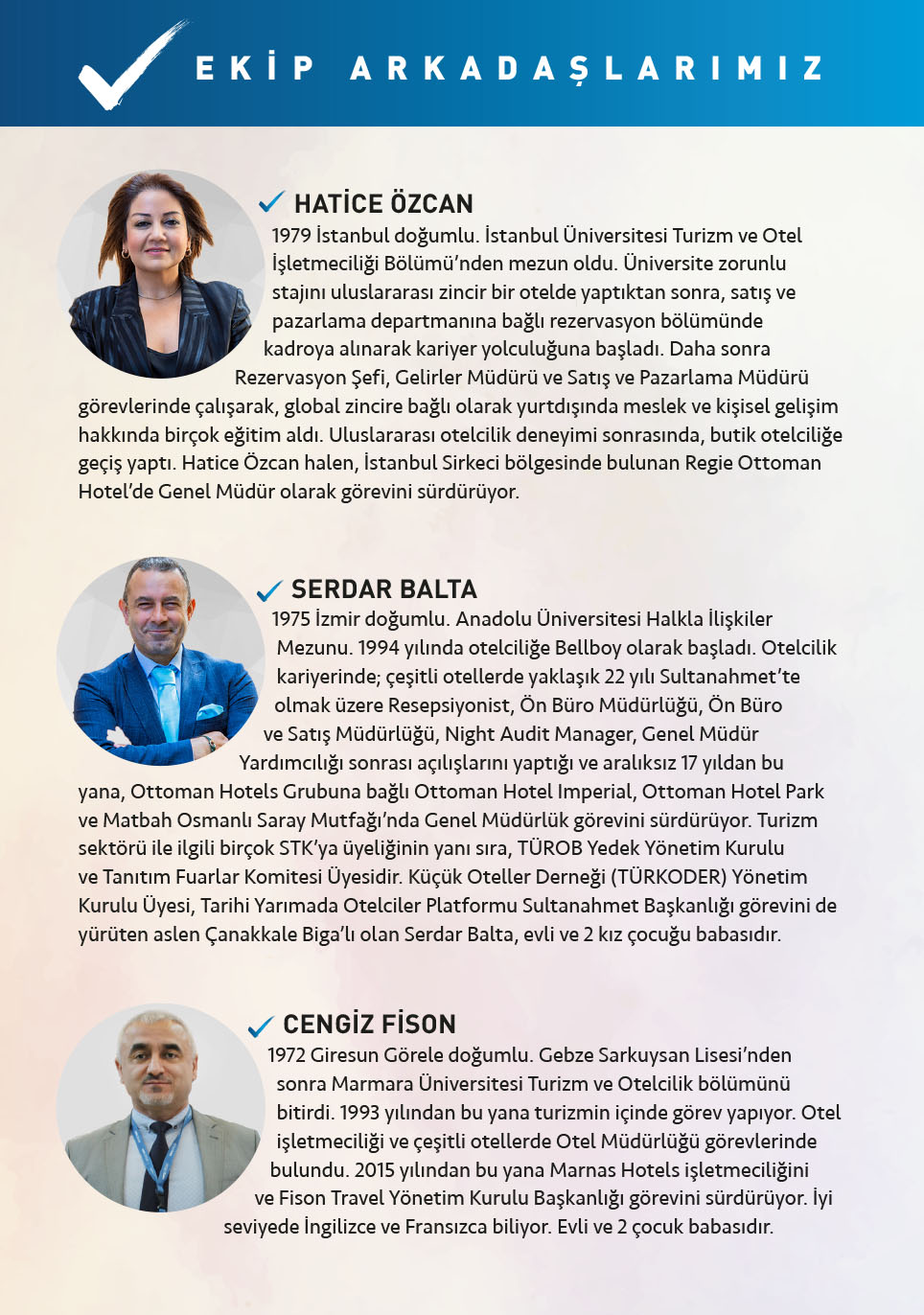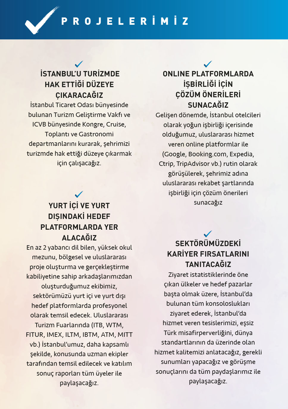 İşte buradan hareketle ben ve ekibim, siz değerli otelci dostlarımın teveccüh ve desteği ile, İTO Oteller Meslek Komitesi’nin yeni döneminde de başkan adayıyım. Burada otelcilerimizin haklarını korumak, sesini daha güçlü duyurmak için var gücümüzle çalışmaya hazırız.”