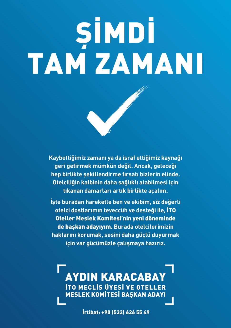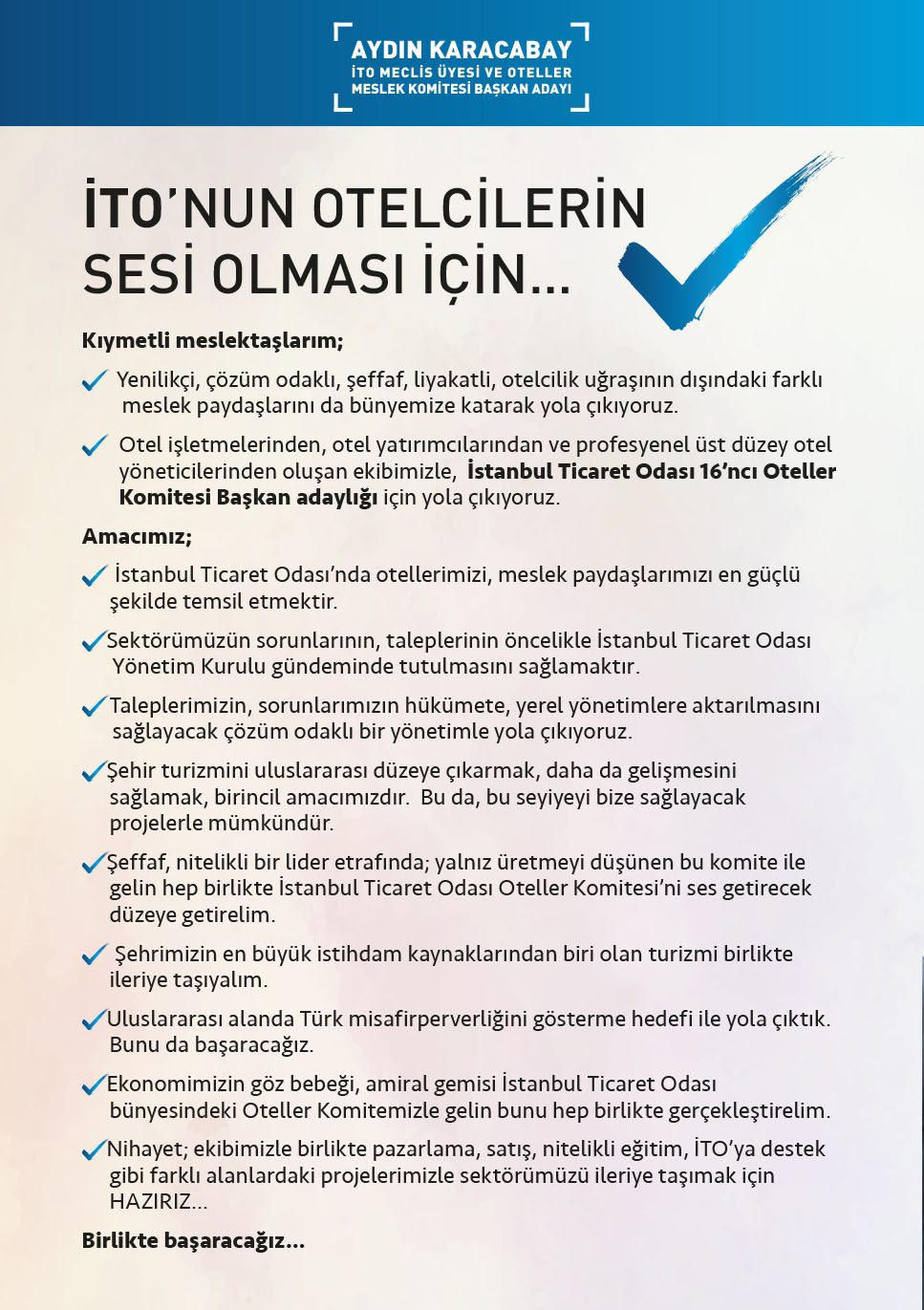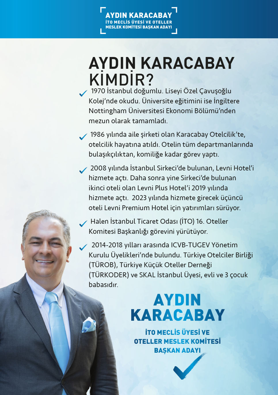 İstanbul Ticaret Odası İTO’nun Kasım ayında yapılacak seçimleri için geri sayım sürerken, Konaklama ve Otelcilik sektörü seçimlerinde 16. Kurul yönetimine aday olan OldCity Otelciler Platformu Yönetim Kurulu Üyesi, Levni Otel Yönetim Kurulu Başkanı Aydın Karacabay, ekibini tanıttığı bir broşür hazırladı. İTO Meclis Üyesi ve Oteller Meslek Komitesi Başkan Adayı Aydın karacabay, BİRLİKTE BAŞARACAĞIZ başlığıyla hazırlanan ve 12 sayfadan oluşan broşürde, neden aday olduğunu maddeler halinde açıkladı.