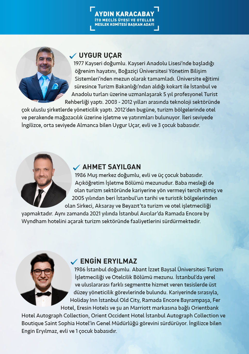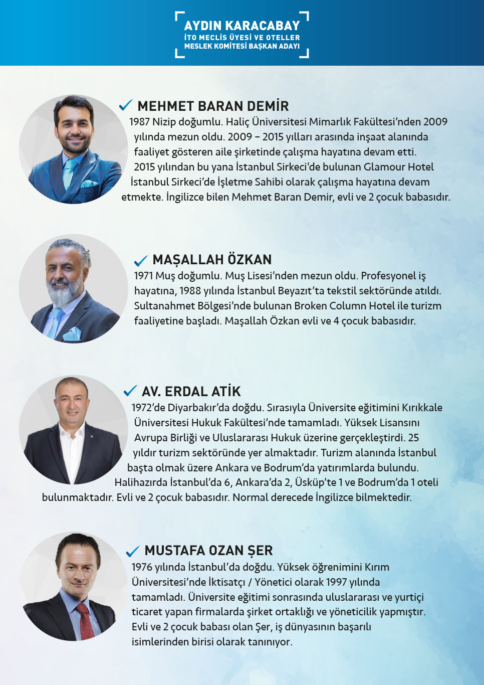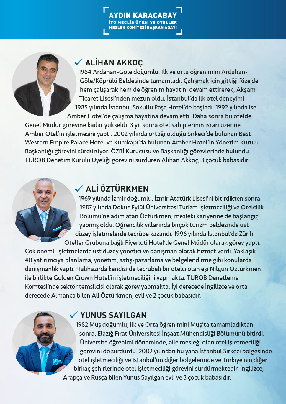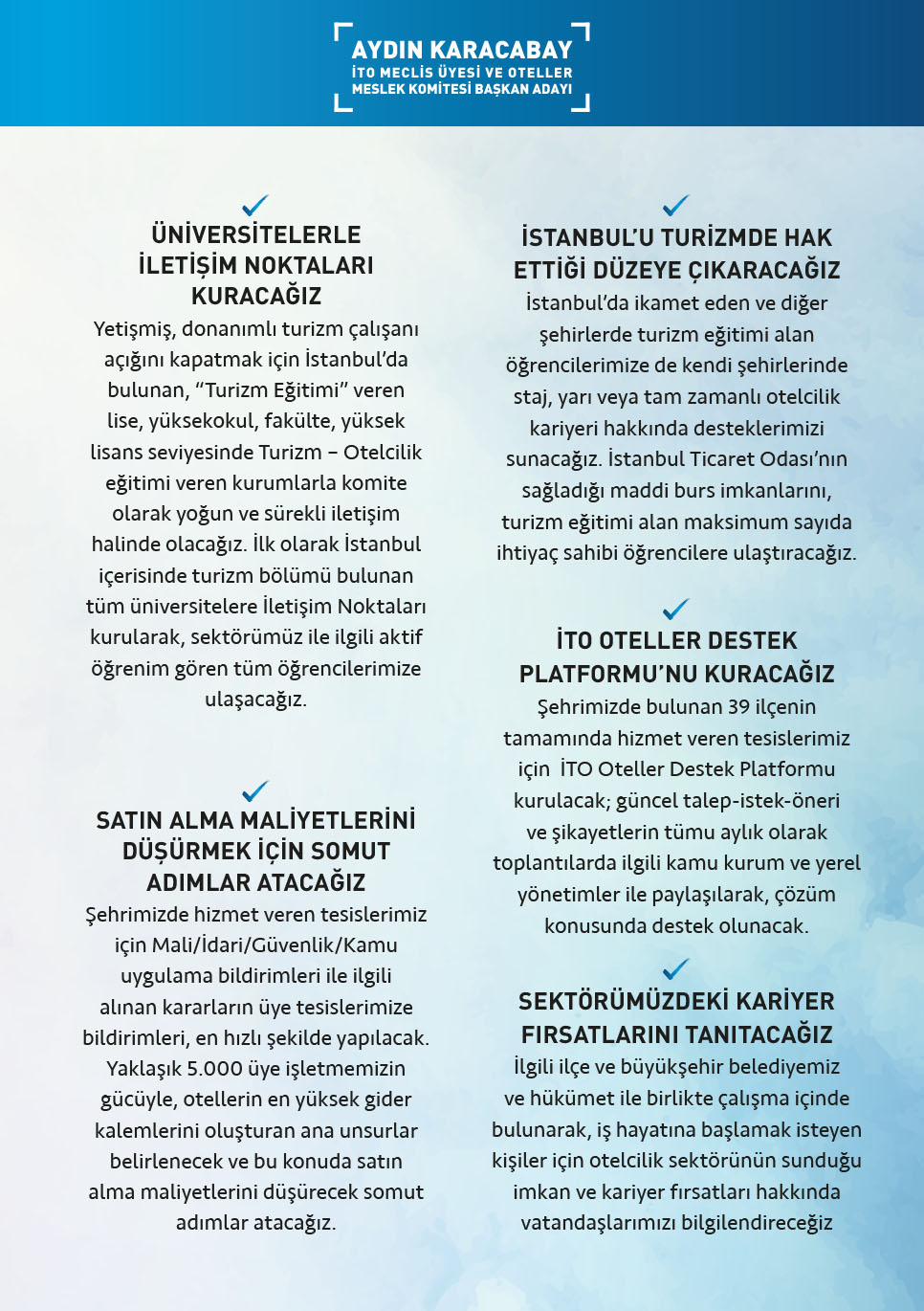 İstanbul Ticaret Odası İTO’nun Kasım ayında yapılacak seçimleri için geri sayım sürerken, Konaklama ve Otelcilik sektörü seçimlerinde 16. Kurul yönetimine aday olan OldCity Otelciler Platformu Yönetim Kurulu Üyesi, Levni Otel Yönetim Kurulu Başkanı Aydın Karacabay, ekibini tanıttığı bir broşür hazırladı. İTO Meclis Üyesi ve Oteller Meslek Komitesi Başkan Adayı Aydın karacabay, BİRLİKTE BAŞARACAĞIZ başlığıyla hazırlanan ve 12 sayfadan oluşan broşürde, neden aday olduğunu maddeler halinde açıkladı.