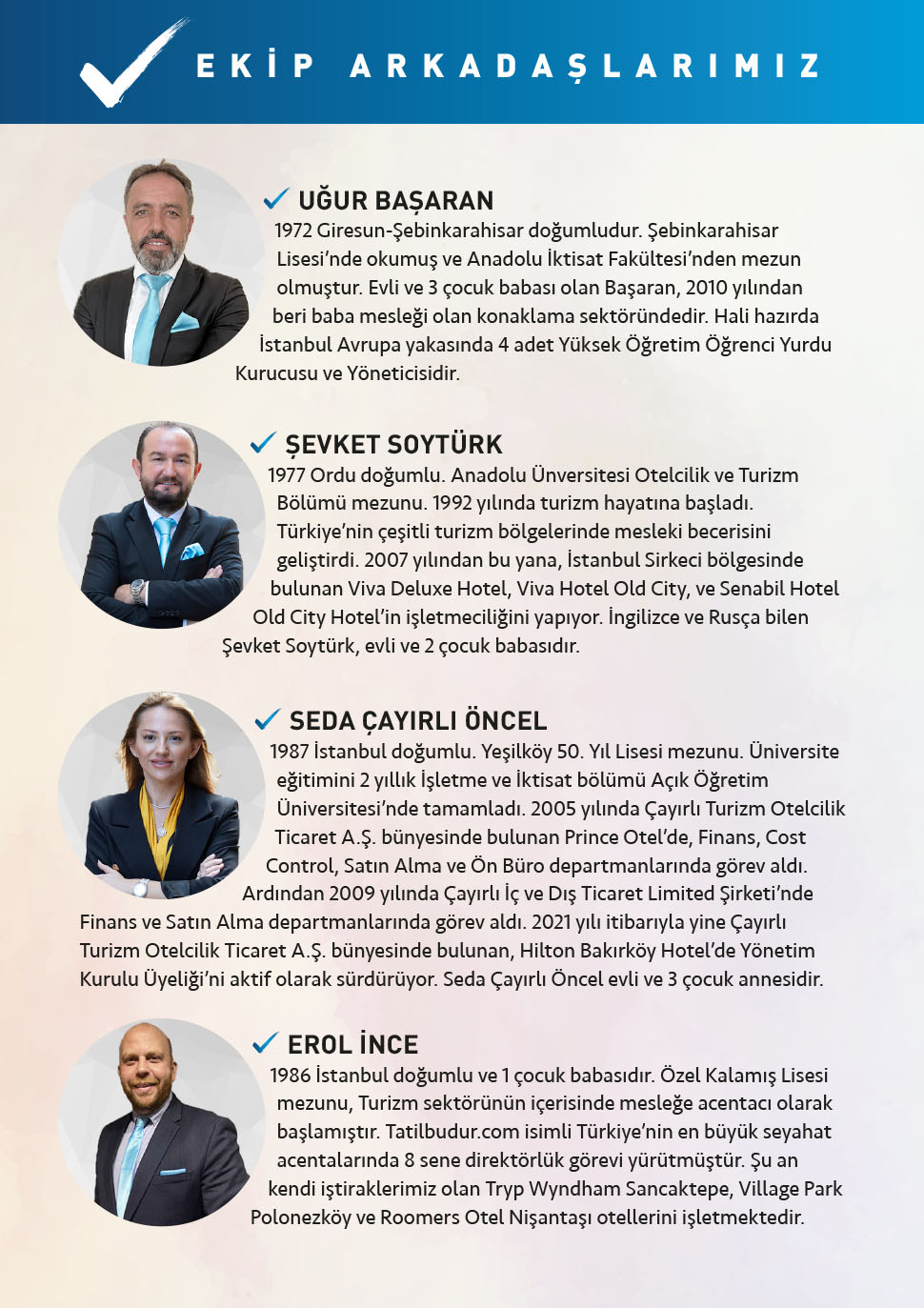 Aydın Karacabay, hazırlanan broşürde 19 kişilik ekip arkadaşlarını tek tek özegeçmişleriyle tanıttı. Daha sonraki bölümde projelerini başlıklar halinde sıralayan Karacabay, broşürün son son sayfasında ŞİMDİ TAM ZAMANI Başlığıyla verdiği mesajda şu ifadeleri kullandı: “Kaybettiğimiz zamanı ya da israf ettiğimiz kaynağı geri getirmek mümkün değil. Ancak, geleceği hep birlikte şekillendirme fırsatı bizlerin elinde. Otelciliğin kalbinin daha sağlıklı atabilmesi için tıkanan damarları artık birlikte açalım.