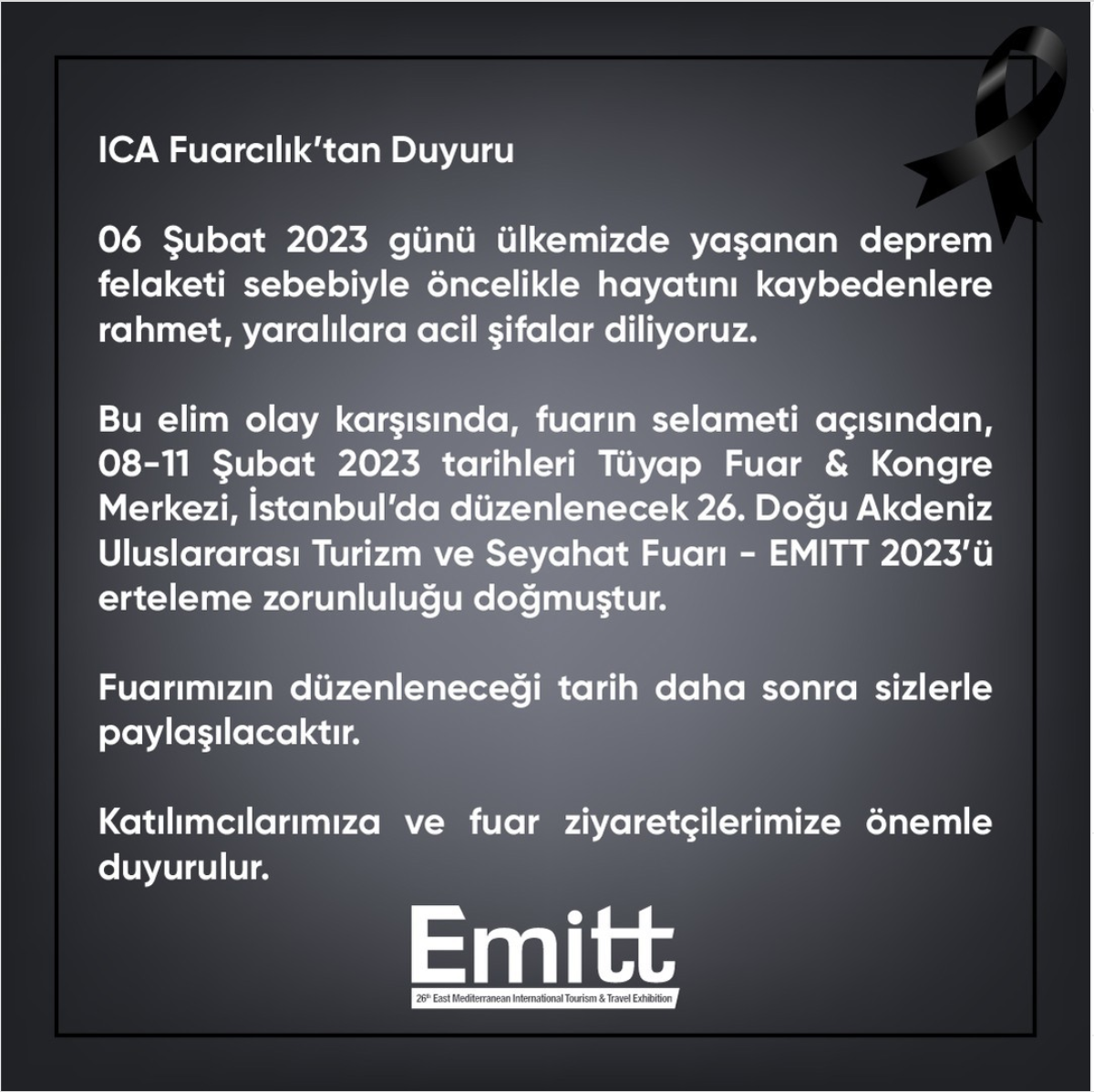 Kahramanmaraş’ta meydana gelen 7.7 ve 7.6’lık depremler nedeniyle EMİTT Fuarı ertelendi. EMİTT Fuarcılık tarafındoan önümüzdeki saatlerde yapacağı toplantıda ertelenme tarihi hakkında açıklama yapılacağı bildirildi.