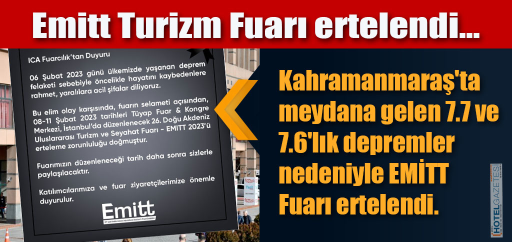 Kahramanmaraş’ta meydana gelen 7.7 ve 7.6’lık depremler nedeniyle EMİTT Fuarı ertelendi. EMİTT Fuarcılık tarafındoan önümüzdeki saatlerde yapacağı toplantıda ertelenme tarihi hakkında açıklama yapılacağı bildirildi.
