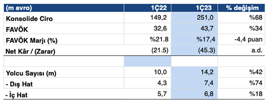 Artışlara dikkat çeken Kaptan, ”Operasyonel olarak oldukça iyi geçen bir çeyreğin ardından ciromuzu yüzde 68, FAVÖK’ü ise yüzde 34 artırdık. 44 milyon avroluk ilk çeyrek FAVÖK’ümüz aynı zamanda pandemi öncesi performansımızı gösteren 2019 yılının ilk çeyreğinde elde ettiğimiz FAVÖK’ün de yüzde 17 üstüne çıktı. FAVÖK’ün altında ise özellikle bir defaya mahsus deprem vergisine ek olarak yükselen faizler ve avronun değer kazanması nedeni ile artan finansman giderleri etkili oldu. Bu giderlerin normalde yılın en zayıf çeyreği olan birinci çeyrekte gerçekleşmesi net kâr üzerindeki etkilerini artırdı ve dönemi 45 milyon avro zararla kapadık. Ancak bu sonuçları daha iyi bir şekilde değerlendirebilmek için cirodan net kâra kadar bütün finansal sonuçların beklentimizden daha iyi olduğunu ve yılın geri kalanı için oldukça kuvvetli sonuçlar beklemeye devam ettiğimizi söylemeliyiz.Yeni varlıklar ve yatırımlarla TAV’ın geleceğini birlikte inşa etmeye devam ediyoruz. Bu geleceği birlikte yarattığımız çalışanlarımıza, hissedarlarımıza ve tüm iş ortaklarına katkıları için teşekkürlerimizi sunuyoruz” diye belirtti.
