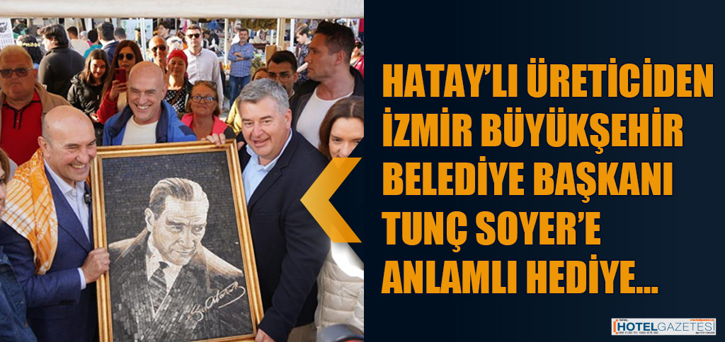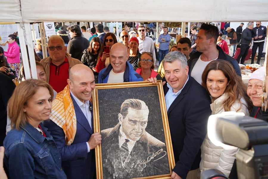Çeşme Belediyesi tarafından bu yıl ‘Yeniden Doğuş’ temasıyla düzenlenen 12. Alaçatı Ot Festivali’nde Belediye Başkanı M. Ekrem Oran, Hatay’lı bir üreticinin yaptığı mozaik Atatürk Portresi’ni Tunç Soyer’e hediye etti.
