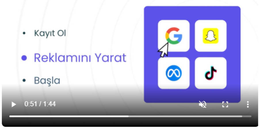 görmelerini sağlıyoruz. Deneme sürecinin ardından müşterilerimizden aylık cüzi bir hizmet bedeli talep ediyoruz. Platformumuza üye olan kullanıcılara herhangi bir SEO veya kodlama bilgisine sahip olmadan kullanımı kolay bir işletim paneli aracılığıyla kolayca reklam kampanyaları oluşturup popüler reklam platformlarının karmaşık yapılarıyla uğraşmadan kolayca reklam verme imkanı sunuyoruz.”