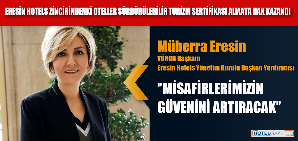 Turizm ve konaklama sektörünün öncü zincirlerinden Eresin Hotels, çevre ve sürdürülebilirlik platformu Global Sustainable Tourism Counsil (GSTC) tarafından tanınan ‘Sürdürülebilir Turizm Sertifikası’ aldı. Eresin Hotels, zincirinde bulunan otellerinde uluslararası düzeydeki kriterlerin yüzde 100’ünü tamamladı ve turizm sektöründe sürdürülebilirlik standardının geliştirilmesine yönelik uluslararası düzeyde belirleyici olan ‘Sürdürülebilir Turizm Sertifikası’nı almaya hak kazandı.
