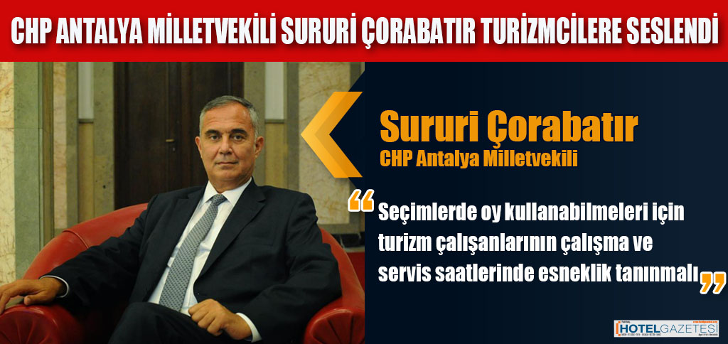 CHP Antalya Milletvekili Sururi Çorabatır, otelcilere seslenerek 28 Mayıs Pazar günü gerçekleşecek olan Cumhurbaşkanlığı 2. tur seçiminde turizm çalışanlarının oy kullanabilmesi için çalışma ve servis saatlerinde esneklik sağlanması çağrısında bulundu.