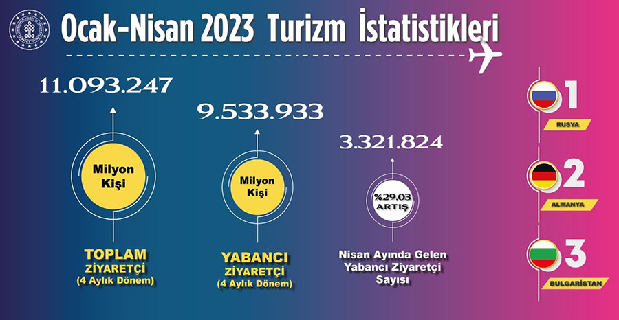 Türkiye 2023 yılının ilk 4 ayında toplam 11 milyon 93 bin 247 ziyaretçiyi ağırladı. İlk 4 ayda yabancı ziyaretçi sayısı geçtiğimiz yılın aynı dönemine oranla yüzde 27,51 arttı ve 9 milyon 533 bin 933 oldu.