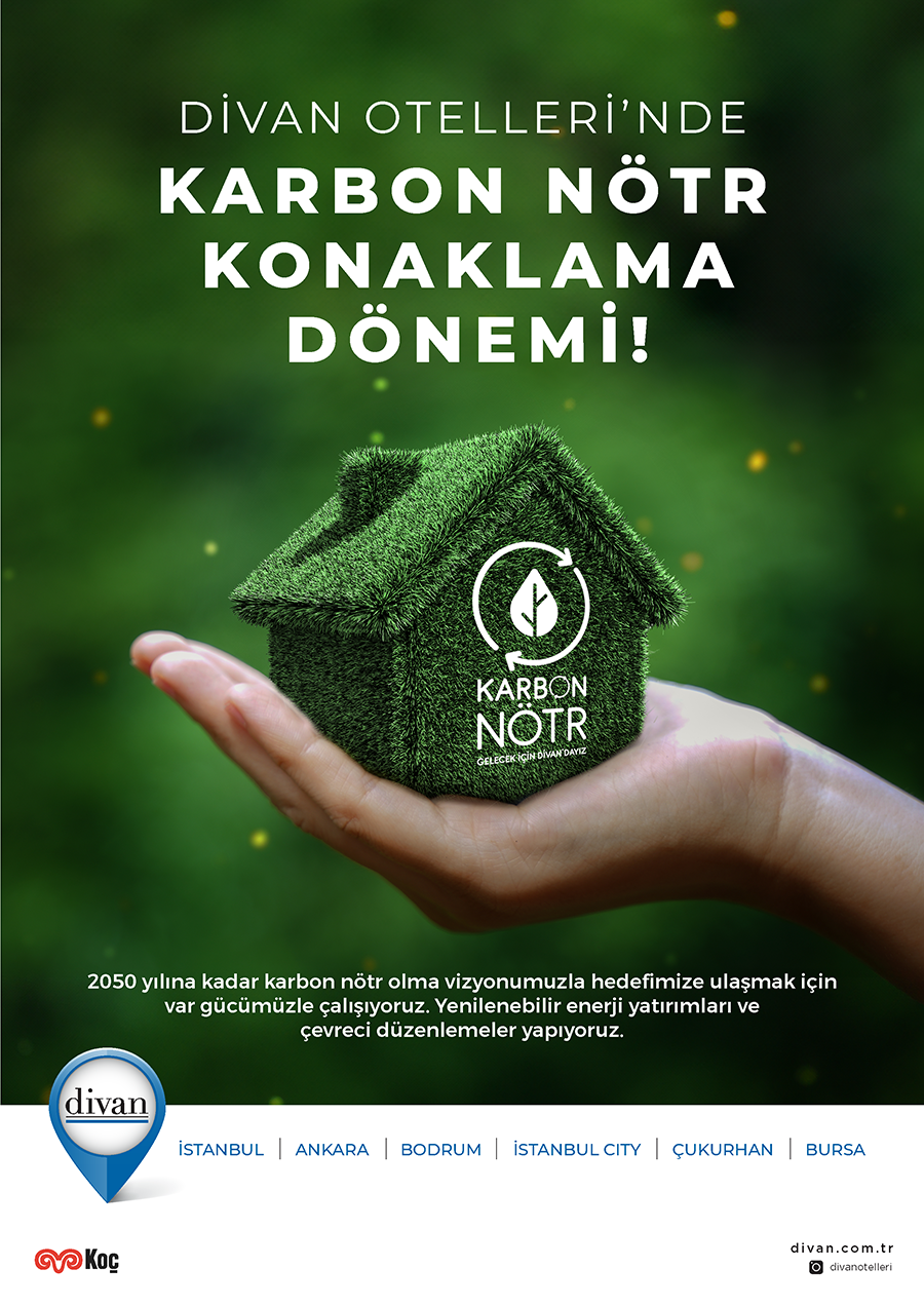 Divan Grubu Genel Müdürü Murat Tomruk, “Divan Grubu olarak, sürdürülebilir bir geleceğe olan kararlı bağlılığımızı ve “Sadece En İyi” ilkesini işimizin her alanına entegre ediyoruz. Toplumsal alanda olumlu bir etki yaratma, çevreye duyarlılık ve insanlara karşı özverili bir tutum sergileme konularında öncü bir misyon üstleniyoruz. Çevreye olan duyarlılığımız ise, sürdürülebilirlik ilkelerine uygun hareket etme hedefimizle birleşiyor. İş süreçlerimizi çevresel etkileri minimize edecek şekilde tasarlıyor ve kaynakları verimli bir şekilde kullanmayı hedefliyoruz. Küresel iklim değişikliğiyle mücadelede ise üzerimize düşen sorumlulukların bilincindeyiz. Sürdürülebilirlik vizyonumuzun merkezinde karbon nötr olma ve karbon nötr konaklama stratejileri bulunuyor. Karbon nötr konaklama ve karbon nötr etkinlik düzenleme seçenekleri de sürdürülebilir bir geleceğe katkıda bulunma yolunda attığımız önemli adımlardan ikisi. Bu yöntem, misafirlerimizin konaklama ve etkinliklerinden kaynaklanan karbon emisyonlarını nötrlemesine olanak sağlıyor. Misafirlerimiz, destek verecekleri ofsetleme projesi sayesinde iklim değişikliğiyle mücadelede aktif rol oynayacak. Bu hususta, Divan Grubu olarak değerli misafirlerimizi karbon nötr bir geleceğe doğru ilerleme hedefimize ortak etmek istiyoruz” dedi.