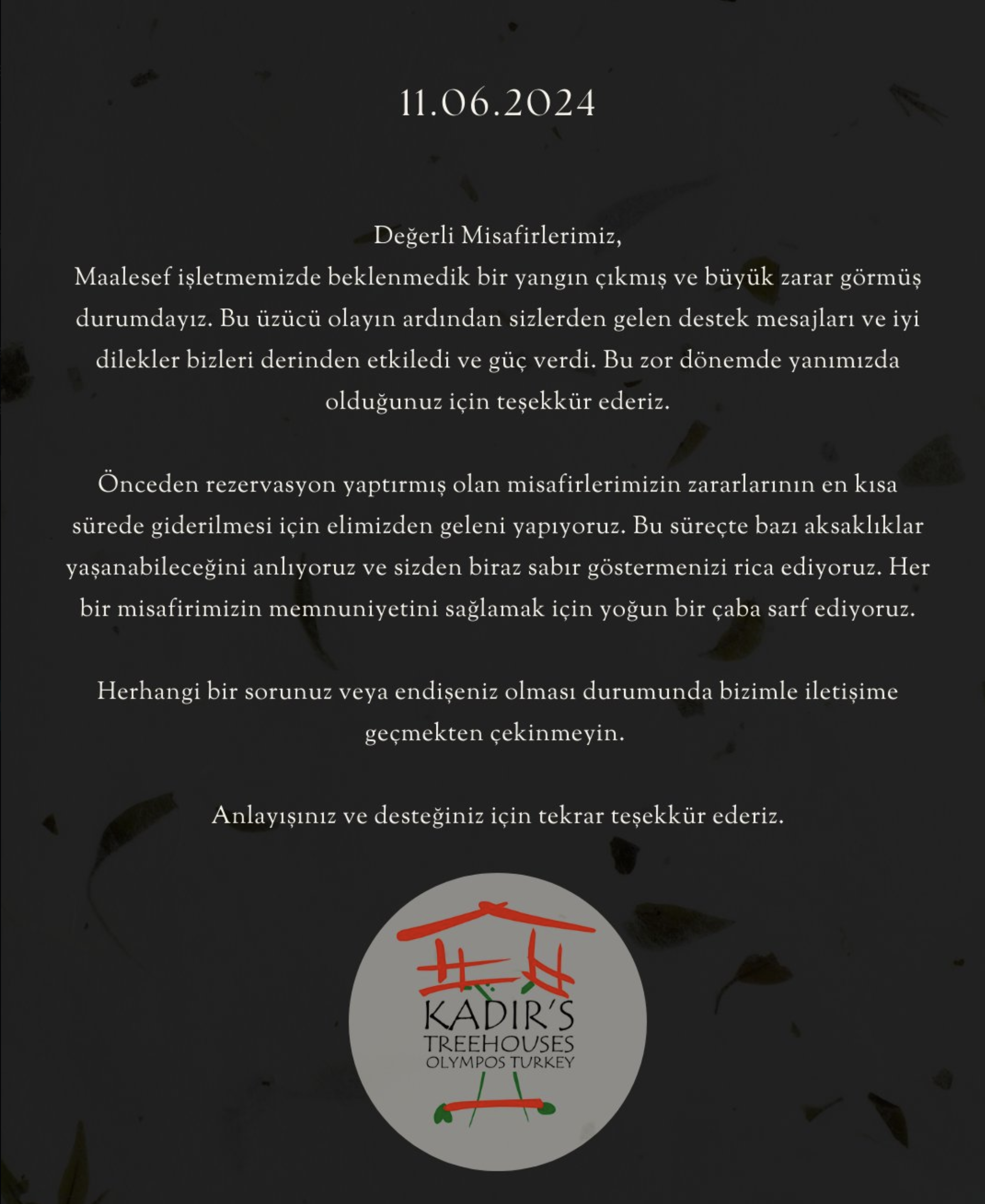 Kadir’in Ağaç Evleri’ne ve Kadir Kaya’ya geçmiş olsun dileklerimizi iletiyoruz. Bu zor dönemde kendilerine güç ve sabır diliyoruz. Umarız ki en kısa sürede toparlanır ve yeniden misafirlerine hizmet verebilirler.