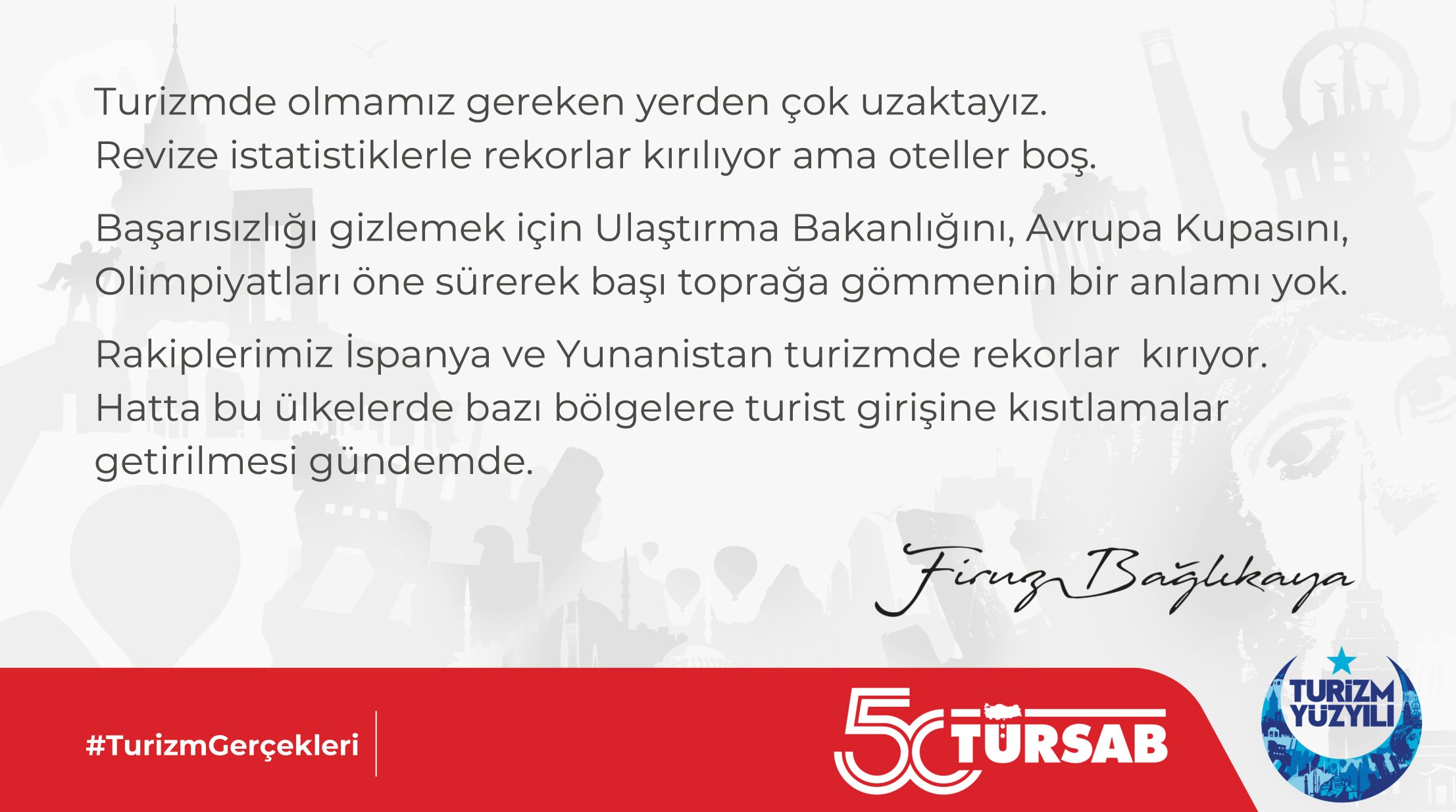 Firuz Bağlıkaya, çeşitli açıklamalarında turizmin zorlu bir dönemden geçtiğini ve otellerin doluluk oranlarının düştüğünü dile getirmektedir. Sosyal medya üzerinden yaptığı paylaşımlarda, Bakan Ersoy’un açıkladığı turizm verilerini sorgulamakta ve Türkiye’nin turizmde daha alınacak yolu olduğunu ifade etmektedir. Ancak, bu tür eleştiriler, TÜRSAB’ın sektördeki aktif rolü ile ne kadar örtüşüyor? Bağlıkaya’nın eleştirilerde bulunurken, TÜRSAB’ın sorumlulukları doğrultusunda somut katkılar sunmaması dikkat çekici bir durum olarak değerlendirilebilir.