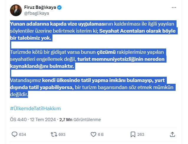 Firuz Bağlıkaya, sosyal medya üzerinden yaptığı açıklamalarla kamuoyunun dikkatini çekmektedir; ancak bu açıklamaların sektör adına ne kadar yapıcı olduğu tartışmalıdır. Özellikle, Yunan Adaları’na kapıda vize uygulamasının kaldırılmasına yönelik söylentilere karşı yaptığı açıklamada, TÜRSAB’ın duruşunu savunduğunu belirtiyor. Bağlıkaya, turizmin mevcut sorunlarına çözüm olarak, rakipleri engellemek yerine turist memnuniyetsizliğinin nedenlerinin bulunması gerektiğini vurguluyor. Ayrıca, vatandaşların kendi ülkelerinde tatil yapma imkânı bulamayıp yurt dışında tatil yapmalarını eleştirerek, “Eğer vatandaşımız kendi ülkesinde tatil yapma imkânı bulamayıp yurt dışında tatil yapıyorsa, bir turizm başarısından söz etmek mümkün değildir,” diyor. Ancak, bu tür açıklamaların ardından somut adımlar atılmaması, sektördeki sorunların çözümüne ne kadar katkı sağladığı konusunda bazı soru işaretlerine neden oluyor.