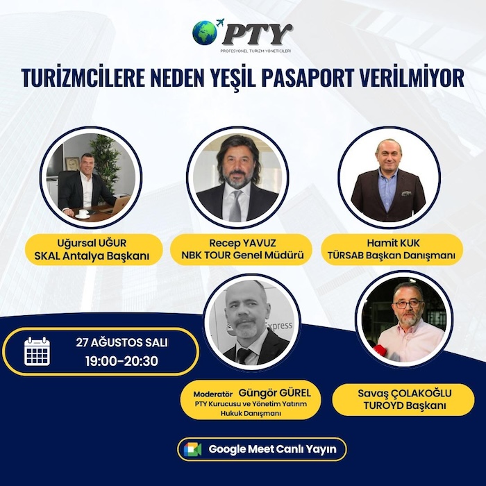 27 Ağustos 2024 Salı günü saat 19:00’da başlayacak olan bu önemli canlı yayın etkinliği, PTY’nin organizasyonu altında gerçekleştirilecek. Etkinlikte, SKAL Antalya Başkanı Uğursal Uğur, NBK Tour Genel Müdürü Recep Yavuz, TÜRSAB Başkan Danışmanı Hamit Kuk ve TUROYD Başkanı Savaş Çolakoğlu gibi sektörün önde gelen isimleri yer alacak. Etkinliğin moderatörlüğünü ise PTY Kurucusu ve Yönetim Yatırım Hukuk Danışmanı Güngör Gürel yapacak.