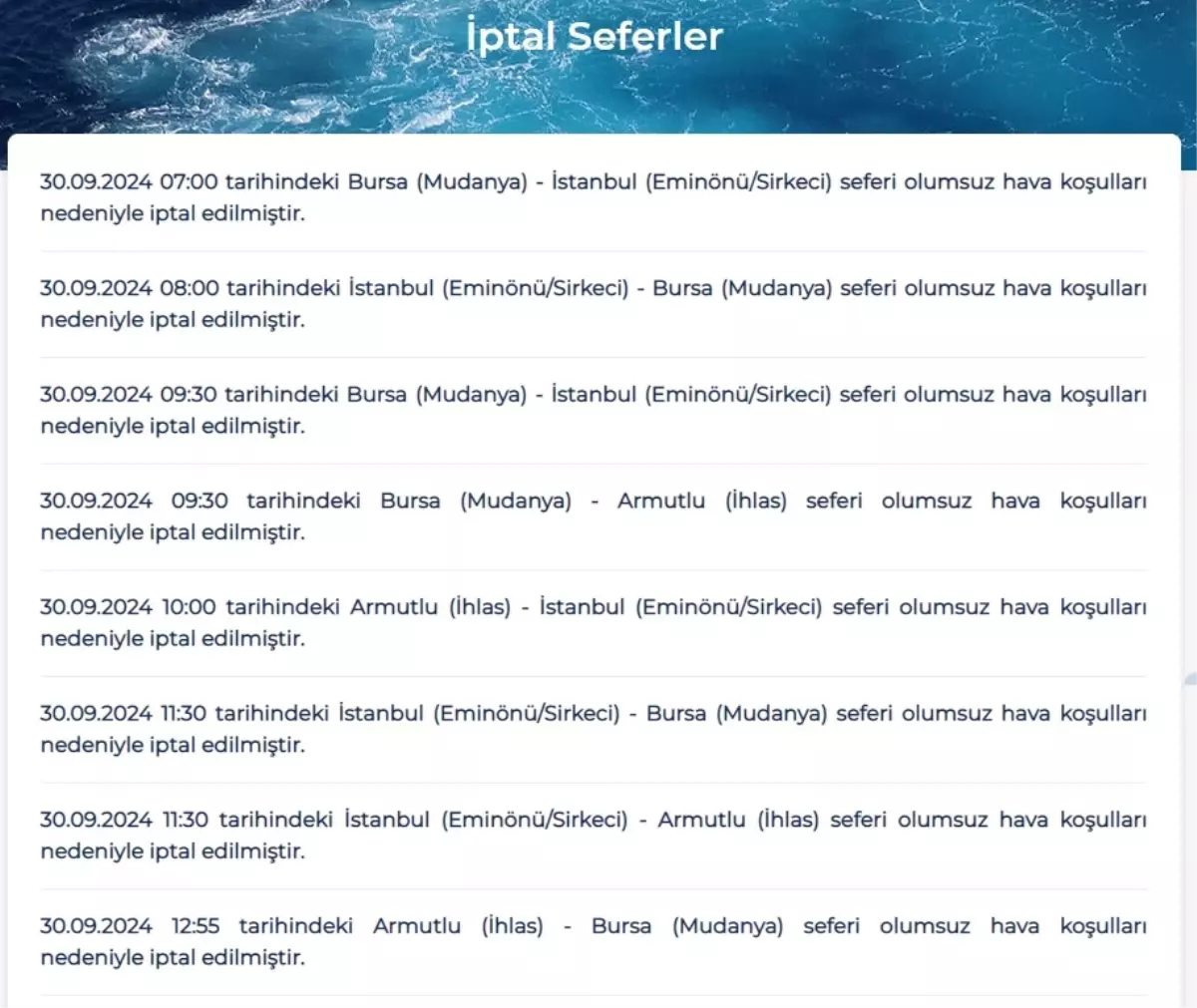 Ayrıca, Bursa (Mudanya) – Armutlu (İhlas), Armutlu (İhlas) – İstanbul (Eminönü/Sirkeci), İstanbul (Eminönü/Sirkeci) – Armutlu (İhlas) ve Armutlu (İhlas) – Bursa (Mudanya) seferleri de iptaller arasında.
