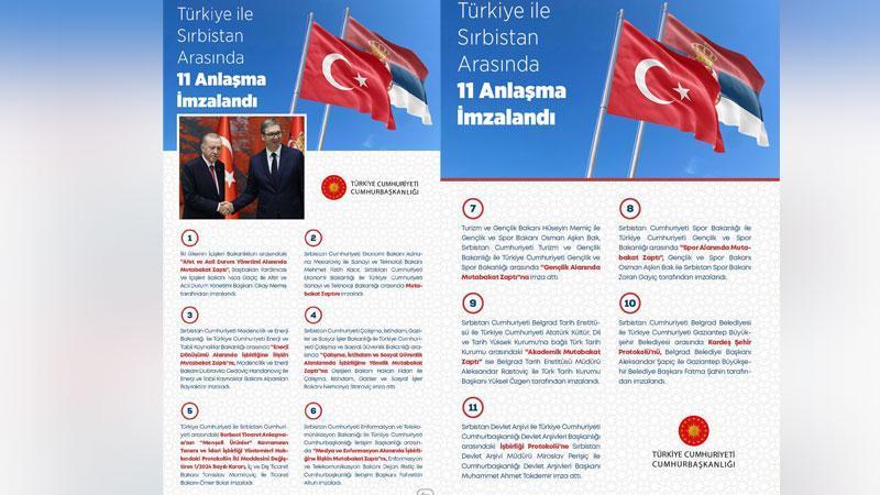 Türkiye ile Sırbistan arasında gerçekleştirilen görüşmeler sonucunda toplamda 11 önemli anlaşmanın imzalandığı duyuruldu. İletişim Başkanlığı’nın sosyal medya hesabından yapılan açıklamaya göre, bu anlaşmalar, iki ülke arasındaki işbirliğini artırmayı hedefliyor.