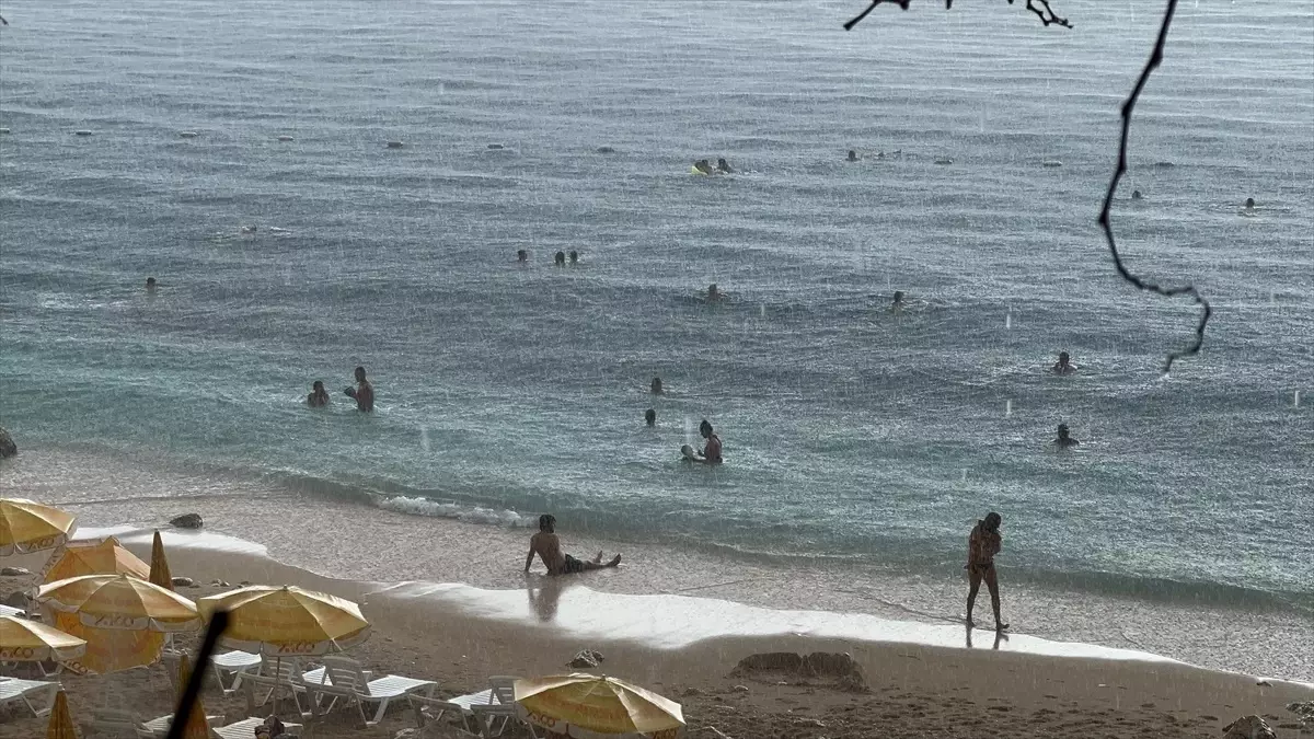 Turizm sezonunun devam ettiği bu dönemde, ilçede hava sıcaklığı 25 derece olarak belirlendi. Kaputaş Plajı’nda bulunan turistler, aniden yağan yağmura aldırış etmeden denize girmeye devam etti.