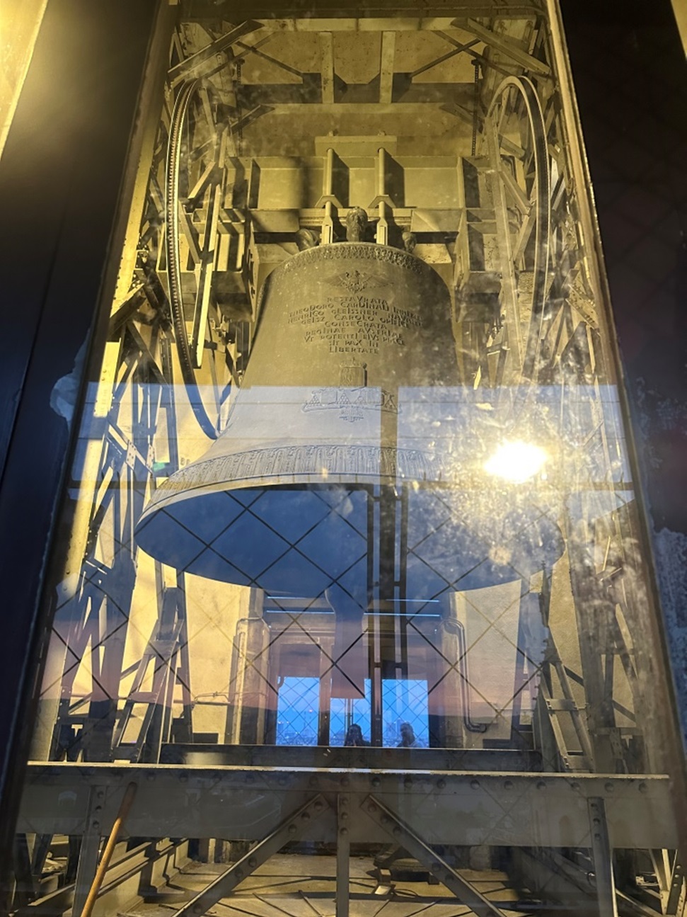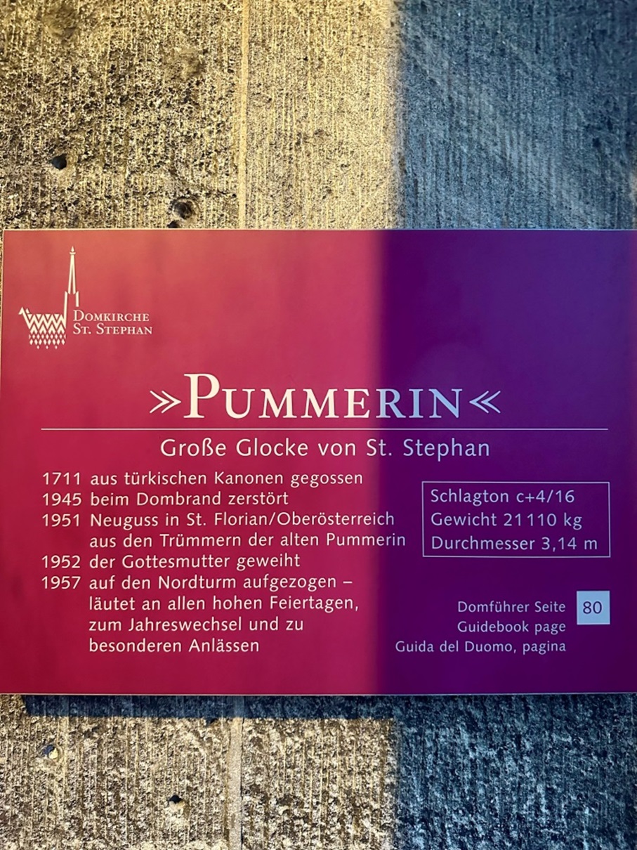 Küçük bir asansör ile en üst kata çıktığımda büyüleyici bir Viyana panoraması beni karşıladı ve böylece tüm şehir kuşbakışı gözlerimin önündeydi. Derken, Pummerin Çanı ile göz göze geldik. Osmanlı ordusunun 2. Viyana Kuşatması’ndan çekilirken bıraktığı topların eritilmesinden elde edilen 21 tonluk bir çan karşımda duruyordu. 1711 yılında İmparator 1. Joseph’in emriyle vaftiz edilmiş bir Türk olan Johann Achammer tarafından döktürülerek yapılmış. 3,15 metre yüksekliğinde olan çanın üzerinde çeşitli kabartmalar, armalar bulunmakta olup, bu çan Türk zaferi nişaneleri ile süslenmiş. Osmanlı’nın tekrar gelebilme ihtimaline karşı, halkı korumak için yıllarca bu çanın yanında bir memur görevlendirilmiş. Ancak Osmanlı tehlikesinin geçtiği düşünülünce bu memur emekli edilmiş.