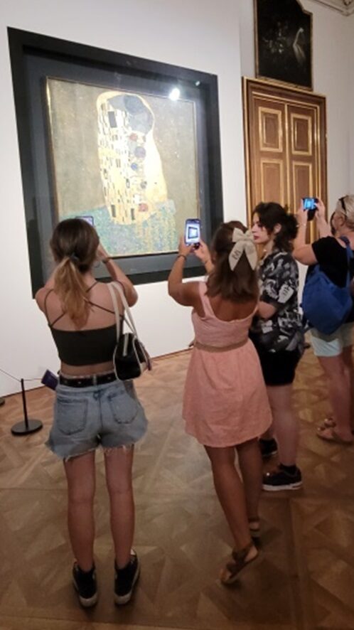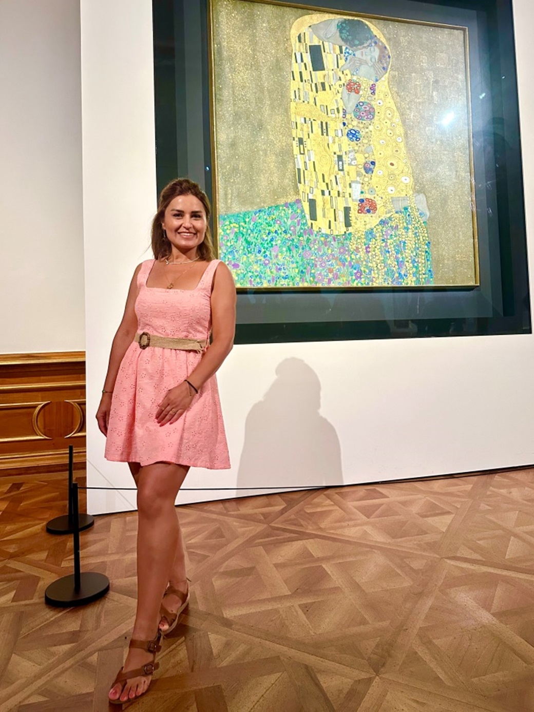 Girişteki gişeye gidip, doğru bileti almak istediğimde ise en erken yarına bilet olduğunu duyunca, o şok etkisiyle yanlış bileti gösterdiğimi fark ettim ve büyük bir sevinçle saray girişindeki görevliye doğru bileti göstererek sonunda içeri girebildim. Belvedere Sarayı’na gelmek istememin en önemli sebeplerinden biri Gustavo Klimt hayranlığım ve eserlerinin orijinal halini görebilmekti. Sarayın iki parçadan oluşan Barok sitilinde bir saray olduğunu söyleyebilirim. Bu kadar güzel yapının göz alıcı ve büyük bir bahçesi var. Havanın çok sıcak olmasından dolayı bahçeyi hızlı geçmek zorunda kaldım. Üst ve alt kat için ayrı ayrı bilet satılıyor, ikisini birlikte aldım. Üst katında Monet, Renoir gibi neo klasik, empresyonist, romantik ve realistik akımlardan eserler, alt katta ise Gustavo Klimt gibi modern sanatçıların eserleri yer alıyor. Klimt’in meşhur Öpücük tablosunu görmek çok güzeldi. Gelmişken her katı görmekte fayda var. Genelde Belvedere deyince Gustavo Klimt ve Öpücük akla gelse de tüm katlarda birbirinden kıymetli ressamların eserleri bulunmakta. Harika bir yapının içindeydim ancak bu yapıdan çok, buradaki resimler dikkatimi çekti. Belvedere Sarayı’nda aslında bir sanat galerisi geziyor gibi hissediyor insan. Belvedere Sarayı’nın diğer özelliği ise halka açık ilk müze olması.